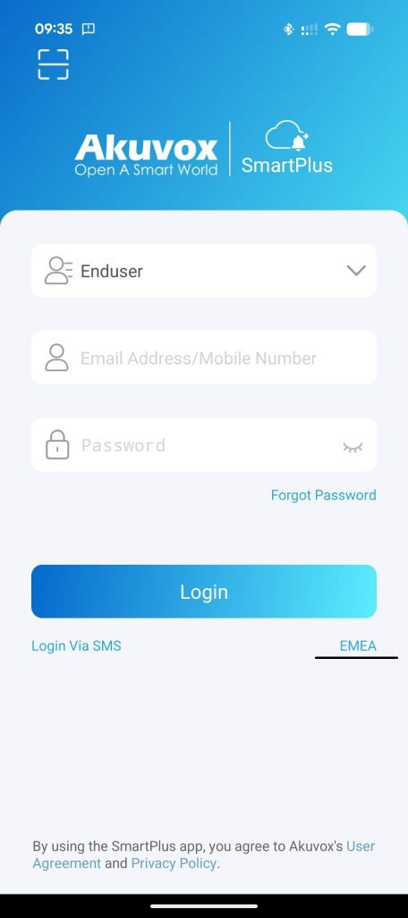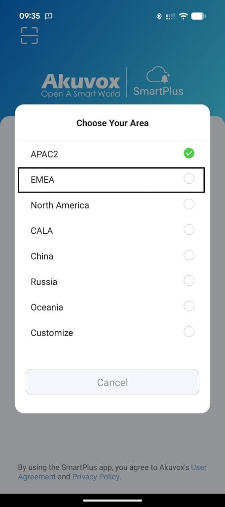 Alternativamente: Puede iniciar sesión directamente en la aplicación utilizando su número de teléfono y un código de verificación enviado por SMS. Al momento de iniciar sesión se debe elegir el servidor EMEA como se muestra en la imagen de otra manera no podra iniciar sesión Manualmente.