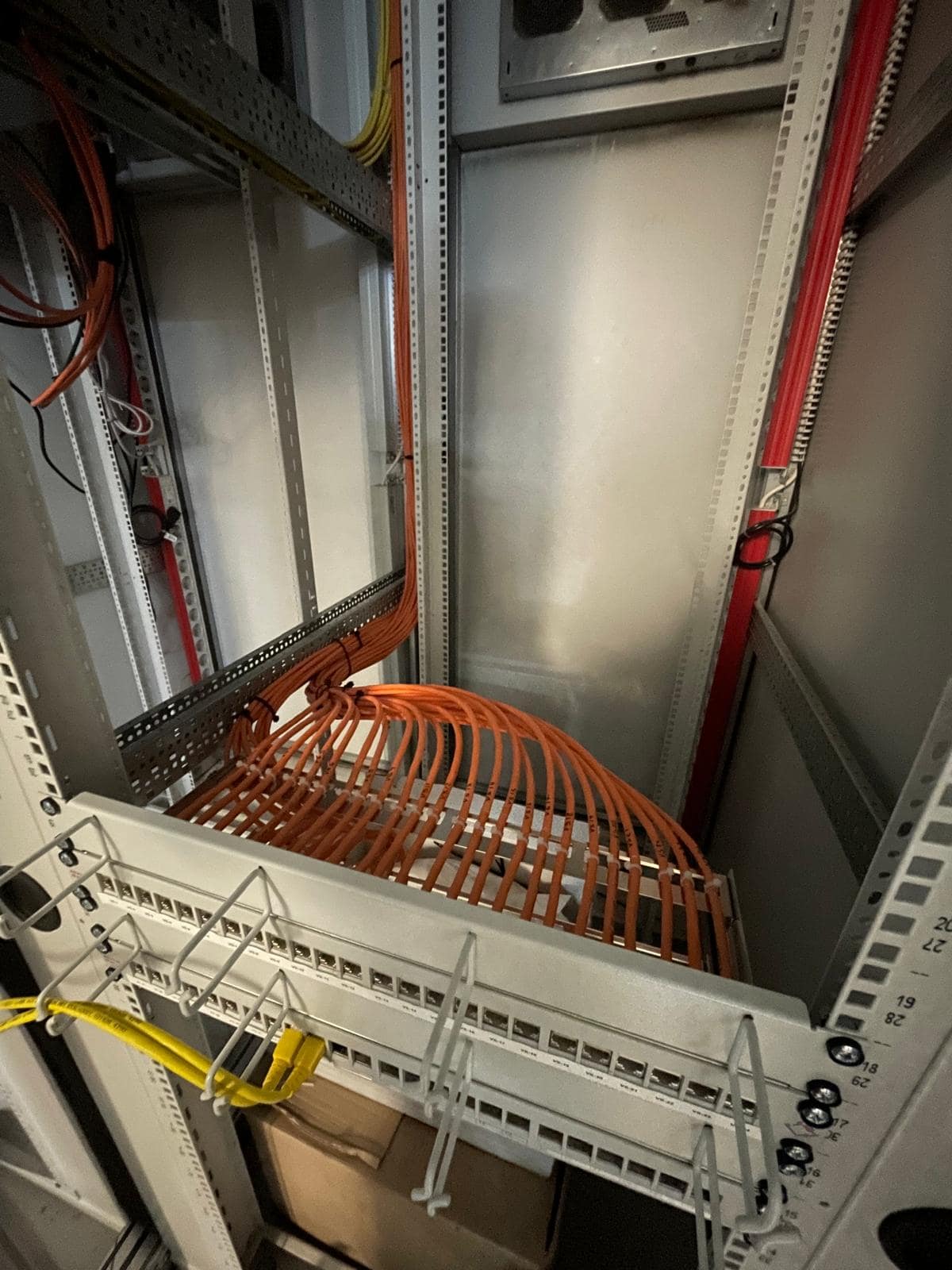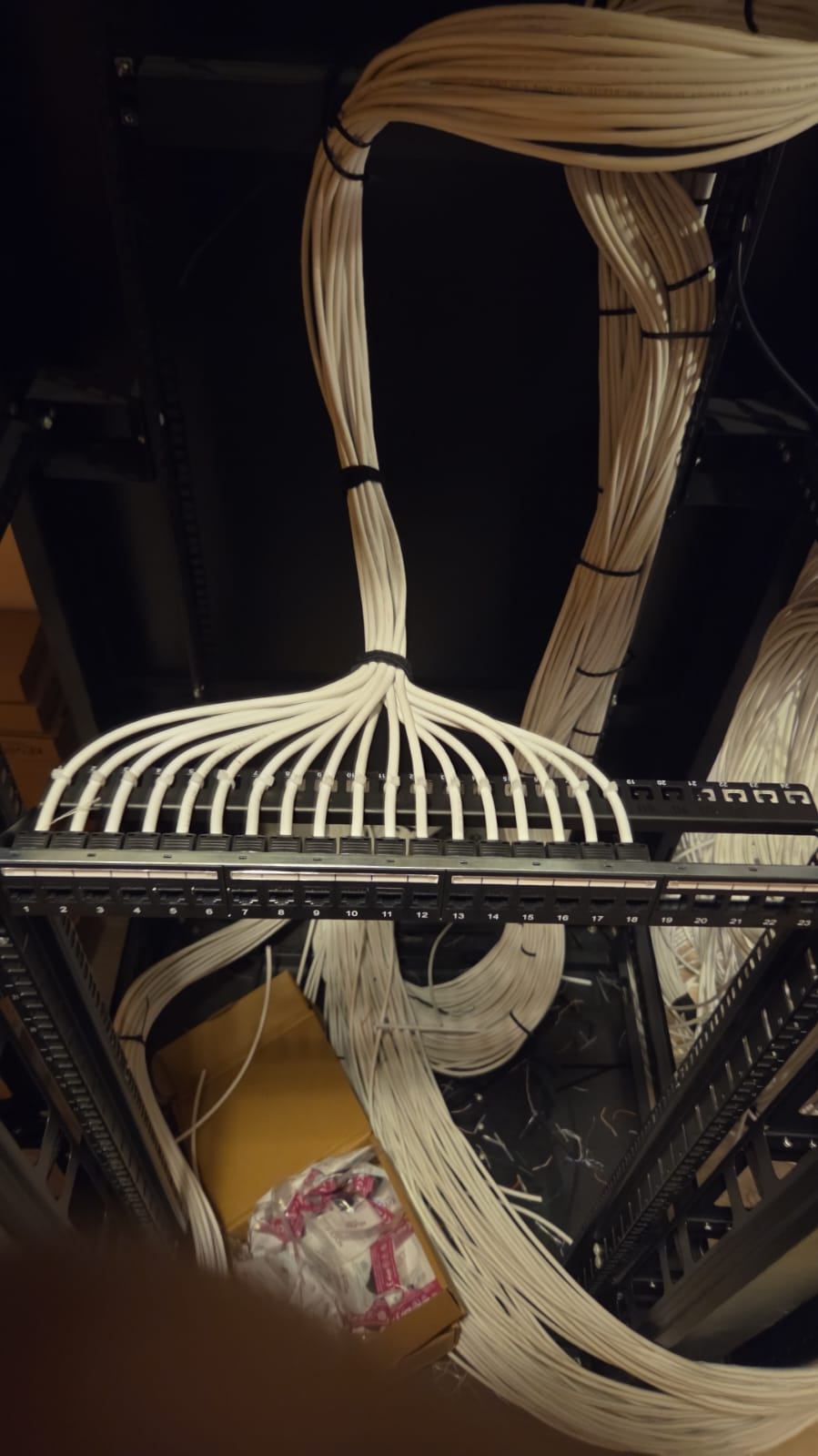 Instalamos racks de comunicaciones y realizamos un cableado estructurado y etiquetado impecable. Mejorando la estetica y facilitando su mantenimiento,